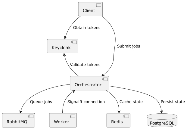 The high-level architecture is shown below. It illustrates how the client interacts with Keycloak for authentication, submits jobs to the orchestrator, and how the orchestrator coordinates state persistence, caching, and distributed execution through the infrastructure components.