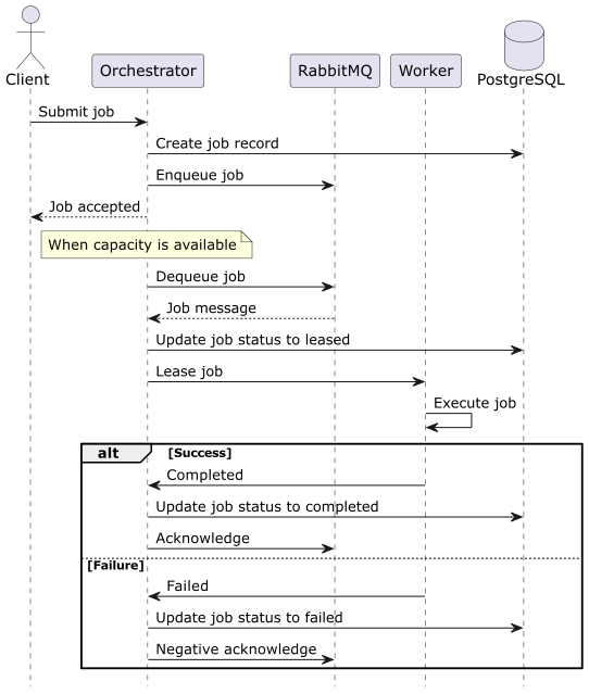 To illustrate how the platform behaves during execution, the sequence below shows the main job lifecycle from submission to completion or failure. It highlights how the orchestrator creates the job record, enqueues the job, leases the job to a worker, and updates the final status based on the execution outcome.