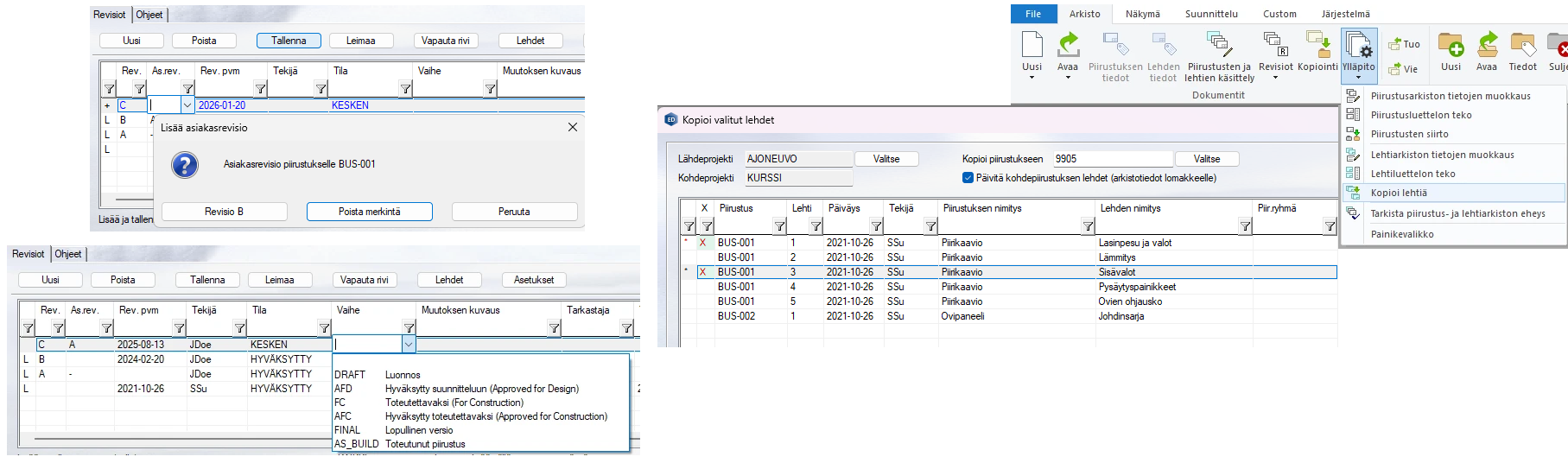 Arkistotoimintojen uudistukset tuovat monipuolisuutta projektien, piirustusten ja revisioiden hallintaan ja ne mahdollistavat esimerkiksi lehtien kopioinnin projektien välillä ja asiakasrevisioiden erottamisen sisäisestä revisioinnista.